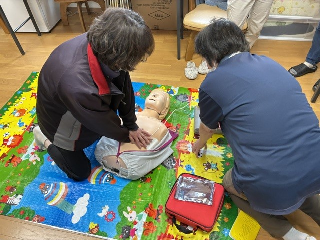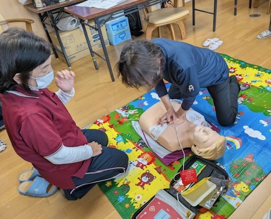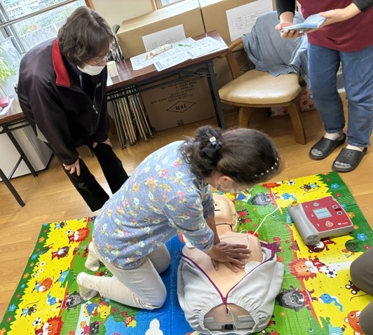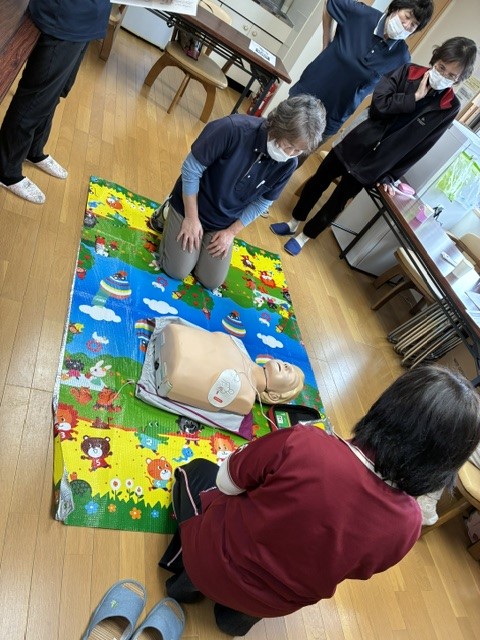 研修用の人形やAEDを使用して、一年に一度行っている研修です。