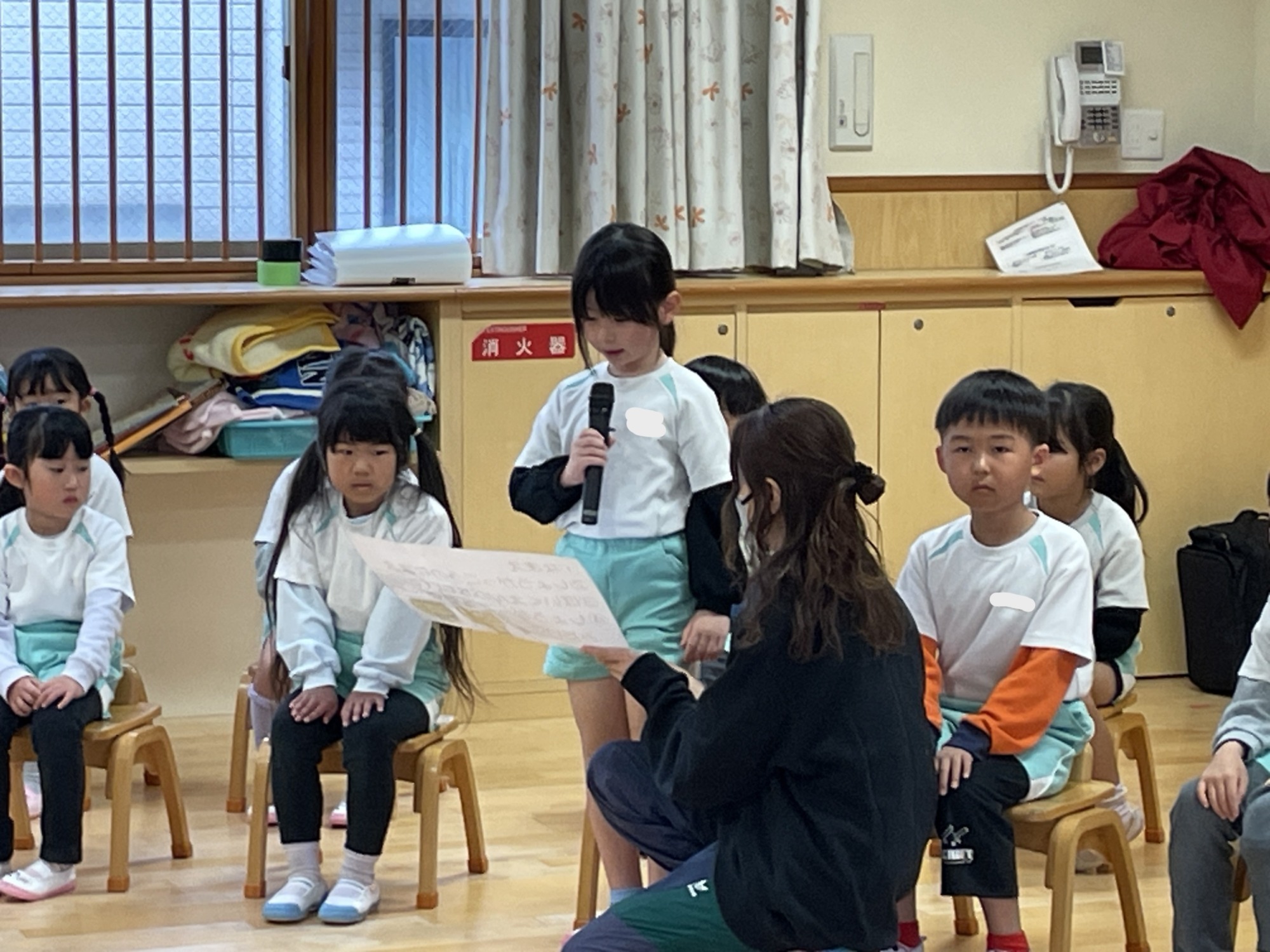 5歳児きりん組の子ども達一人ひとりから小学校でがんばりたいことを聞いたり、1年間の写真を皆で見たりして、これまでの思い出を振り返りました。