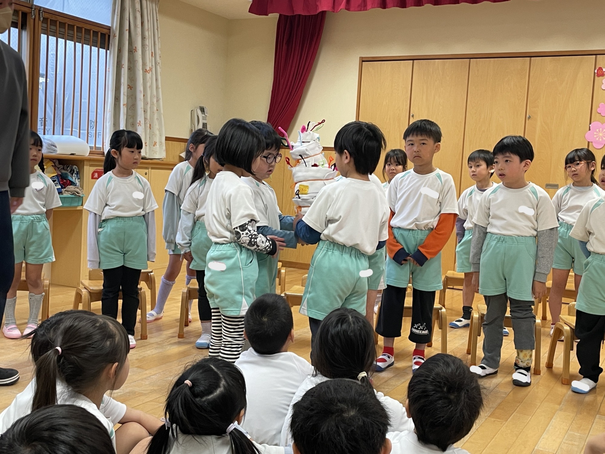 今日は3歳児ぱんだ組・4歳児くま組と一緒にきりん組のお別れ会を行いました。