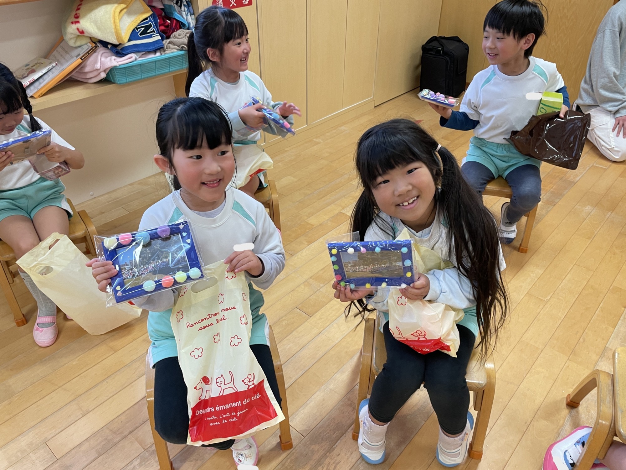 一人ひとりに向けて手作りした写真立てとペン立てです。5歳児きりん組の子ども達はとても嬉しそうに受け取っていました。在園児の思いがしっかりと伝わったようでした。