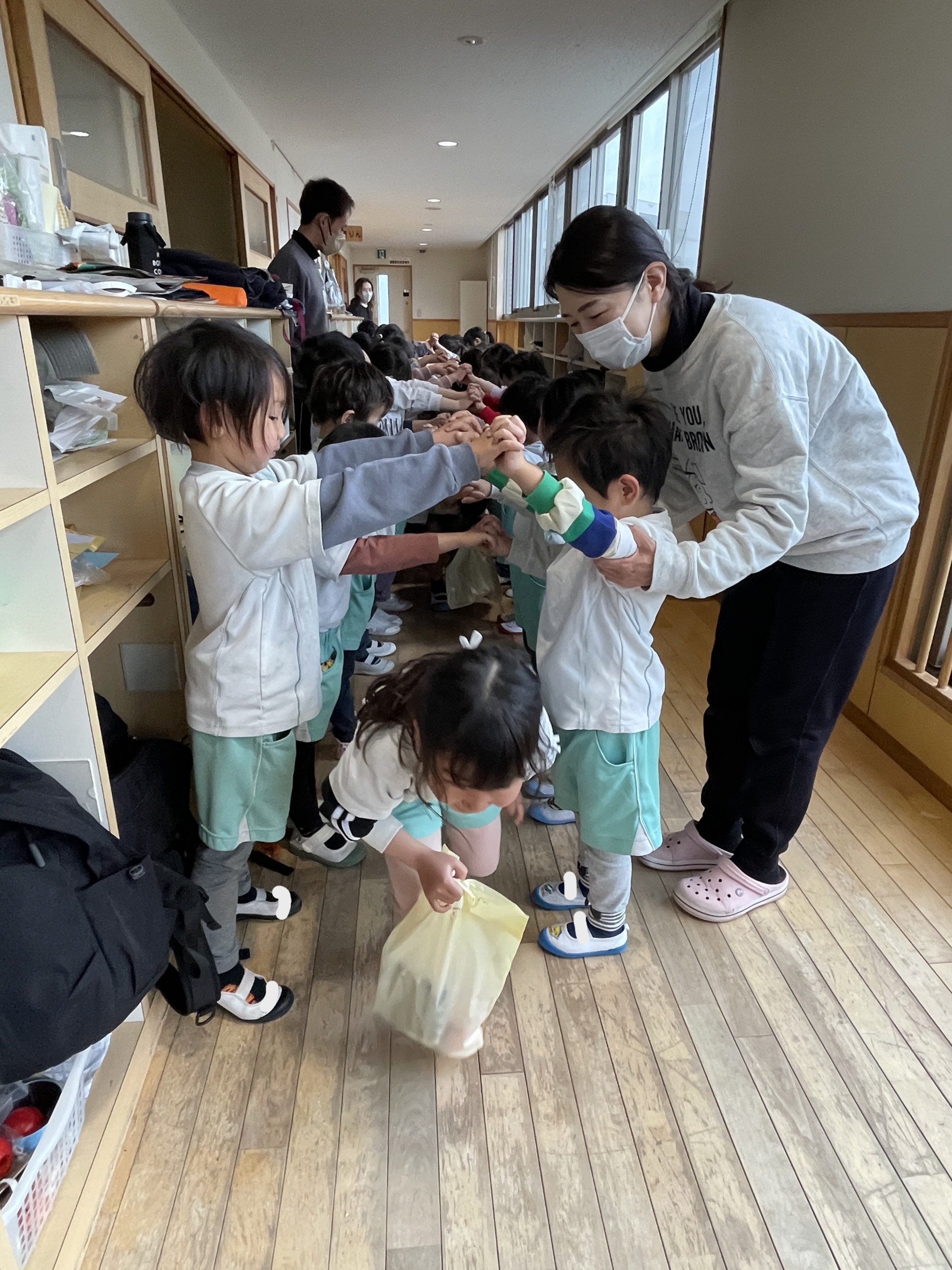 「♪またね」の歌を歌った後は、皆で花道を作り5歳児きりん組の子ども達を見送りました。
