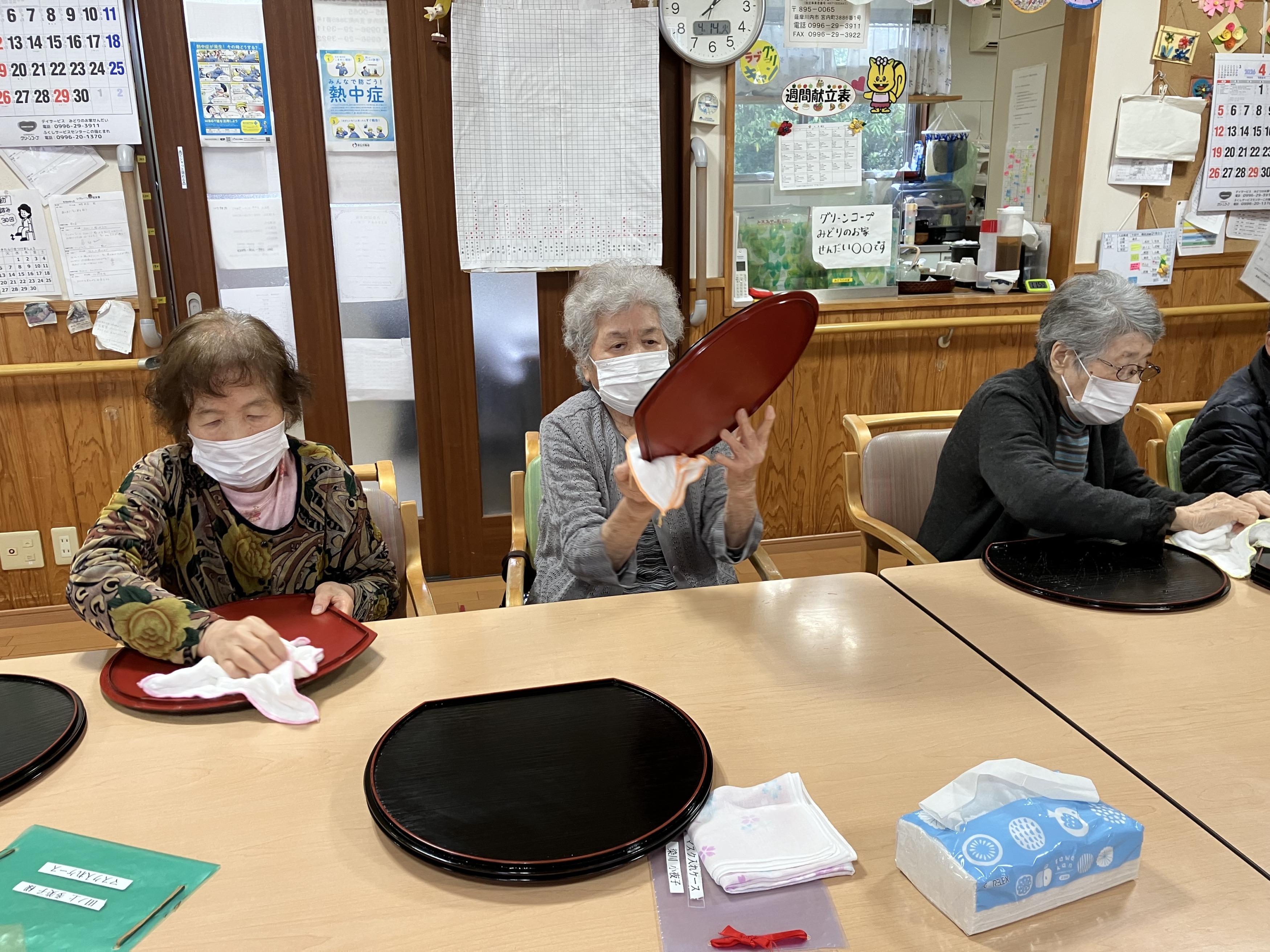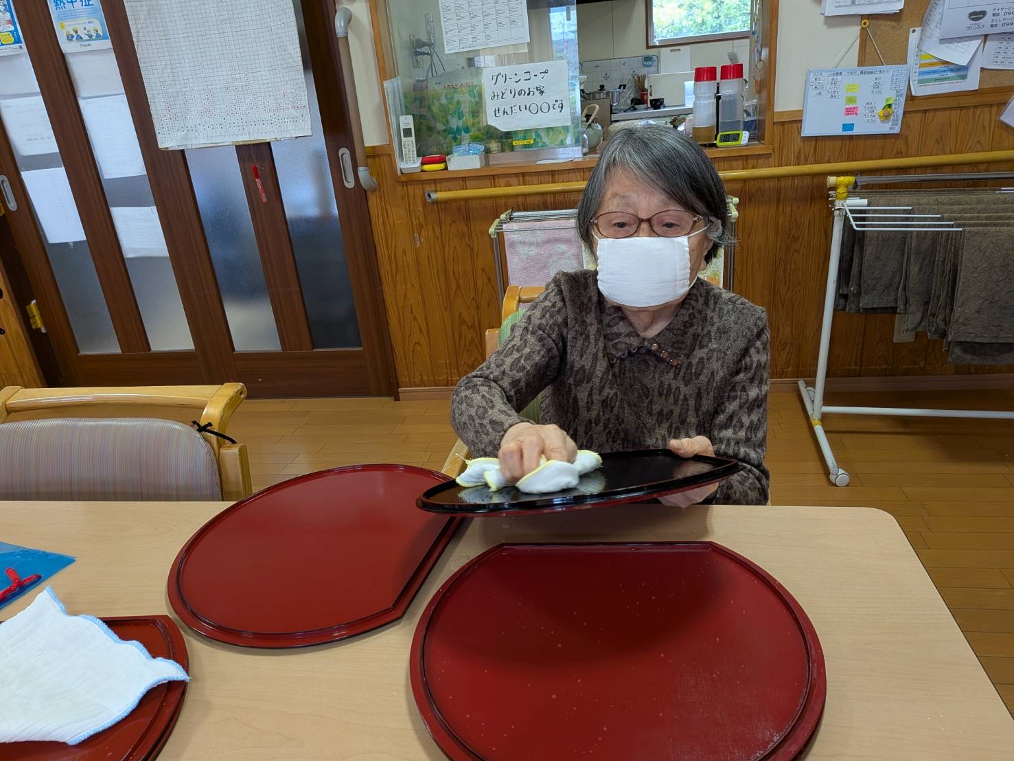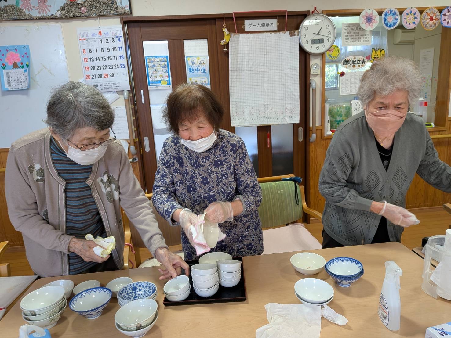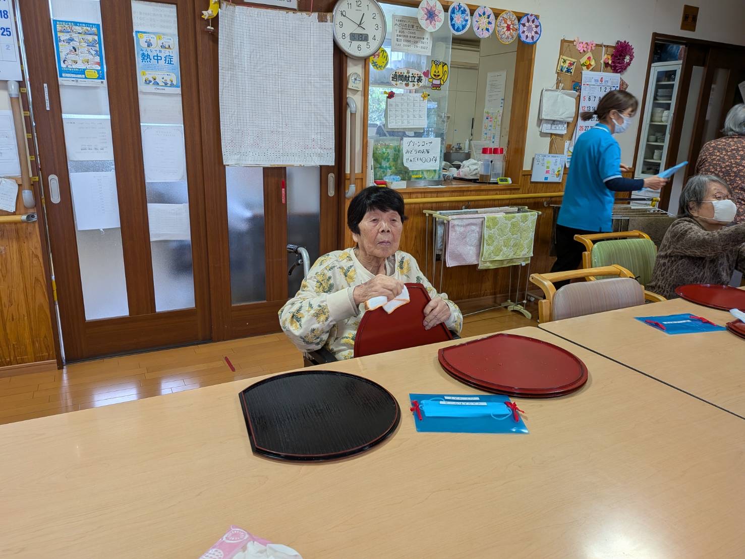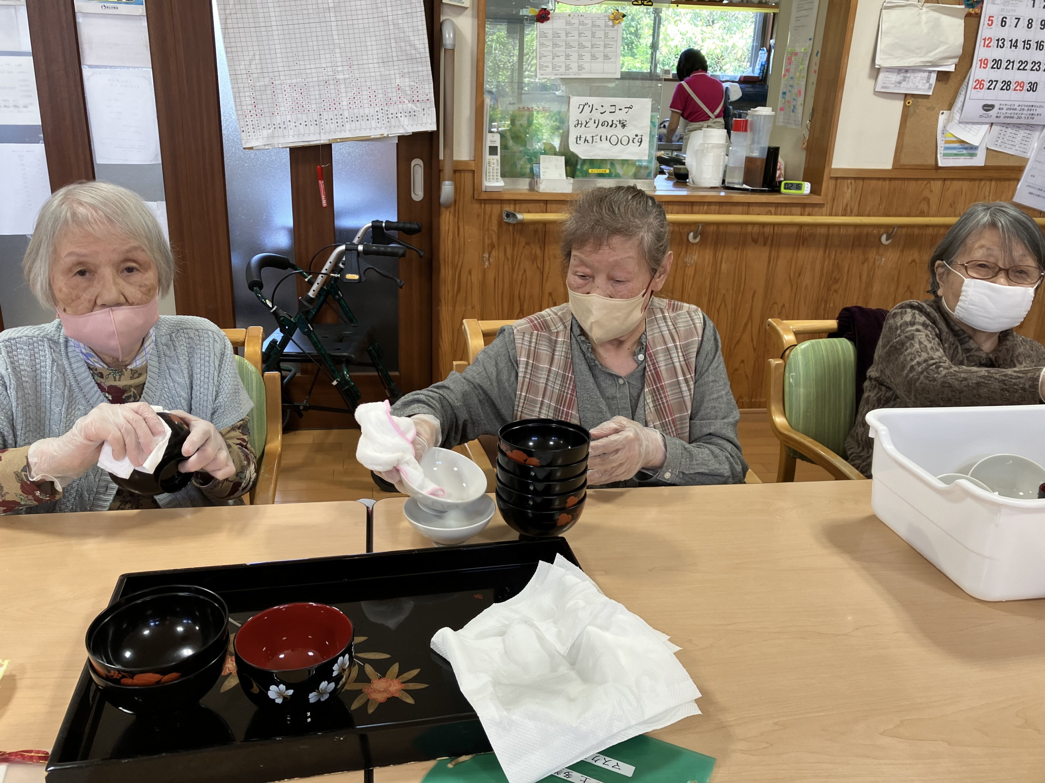 食事が終わると、ごみ集めや洗濯物干し、テーブルを拭きや、お盆を拭き、お茶碗を拭きのお仕事を数人で手分けして取り組んでくださいます。