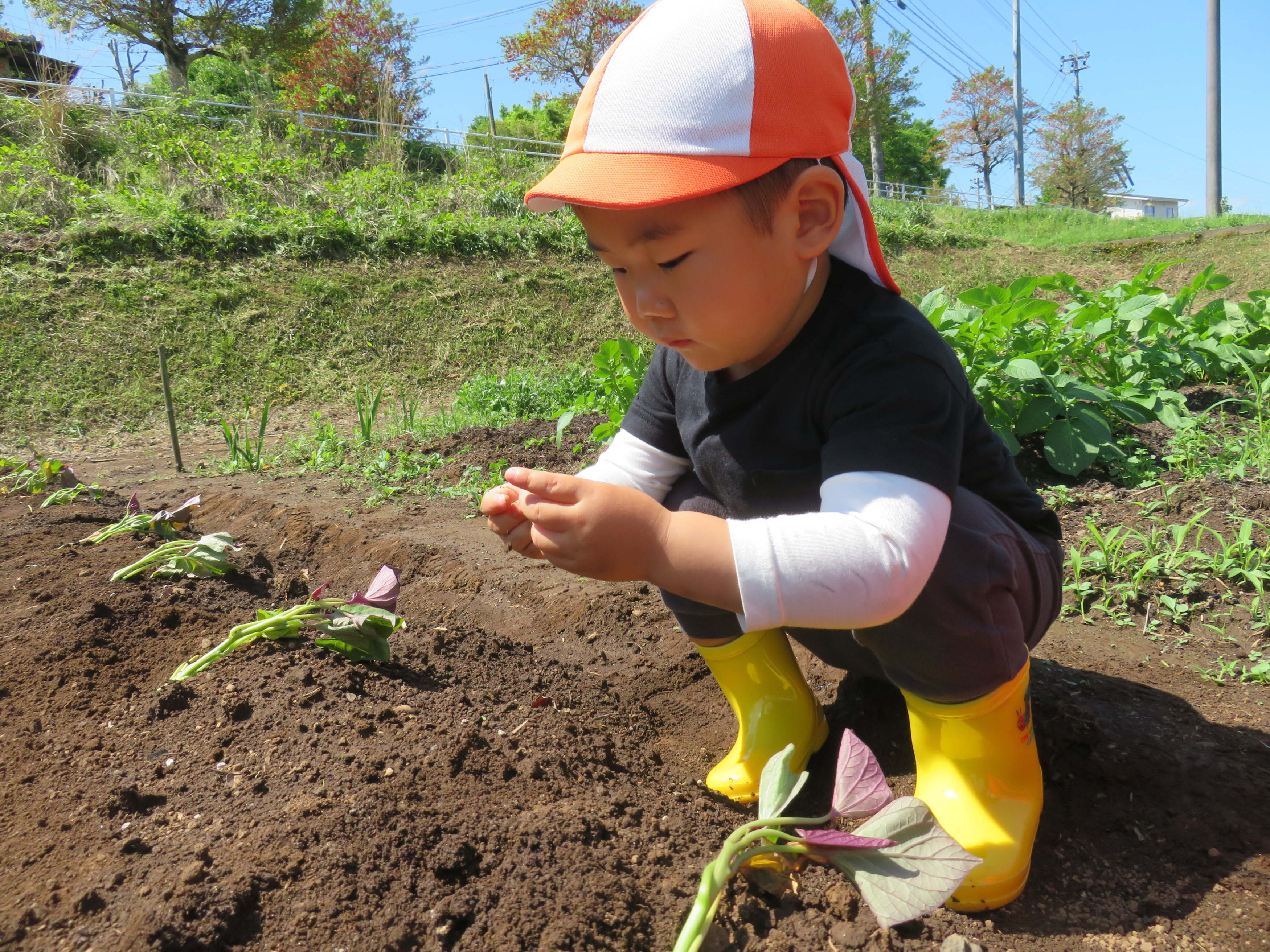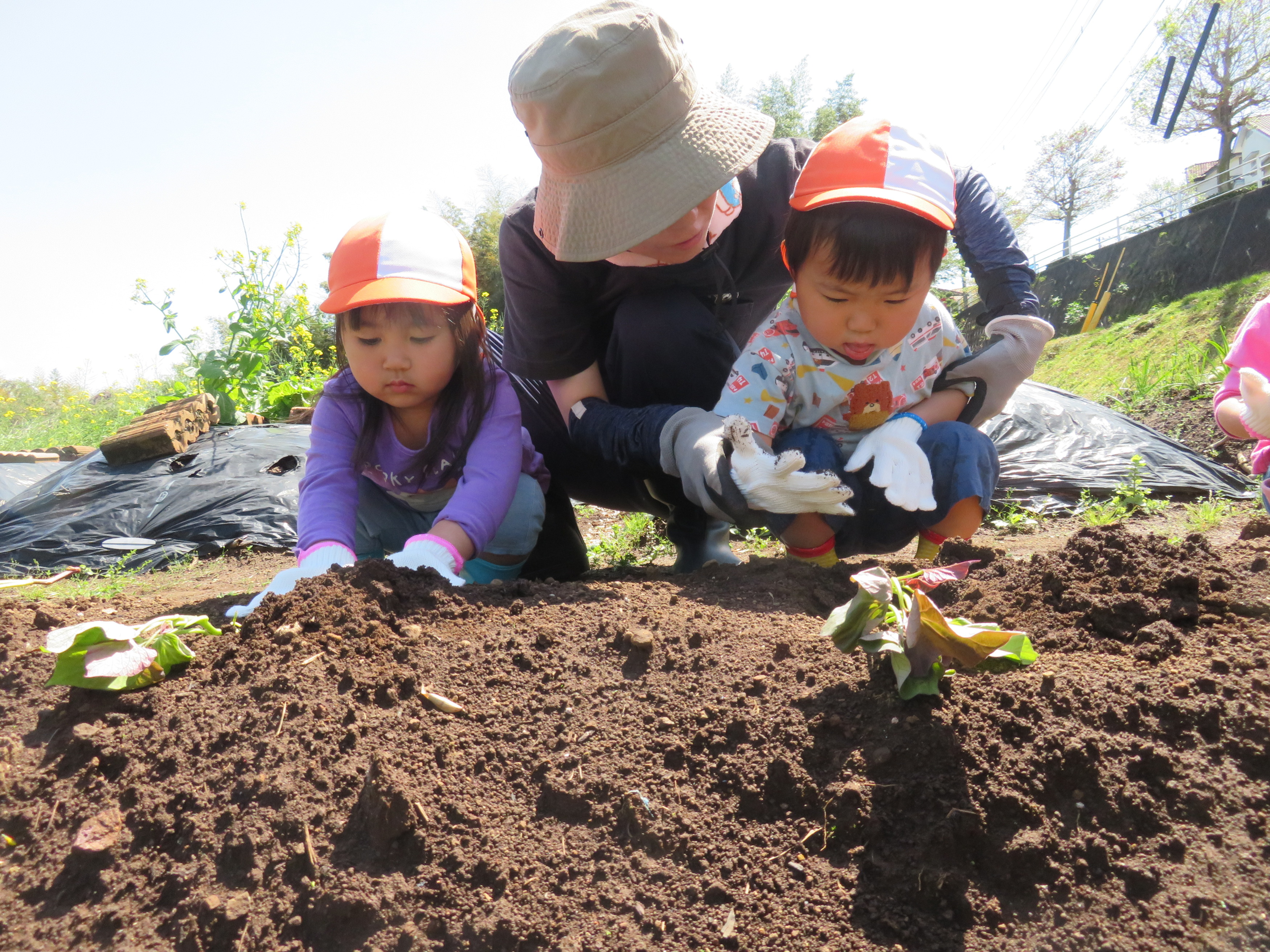 苗の上に土のお布団をかけてあげて「おおきくなあれ🍠」とおまじない🌟