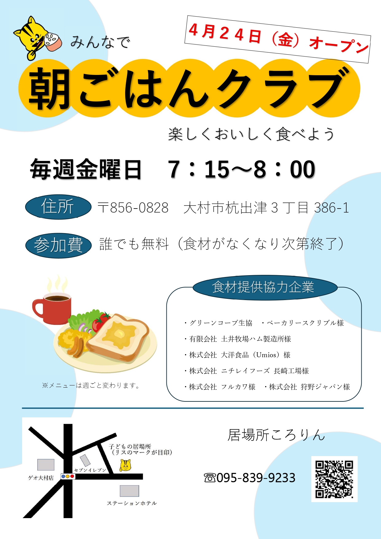 | どなたでも無料で参加できます。 みんなでおいしい朝食を摂って、元気な1日を過ごしましょう! |
