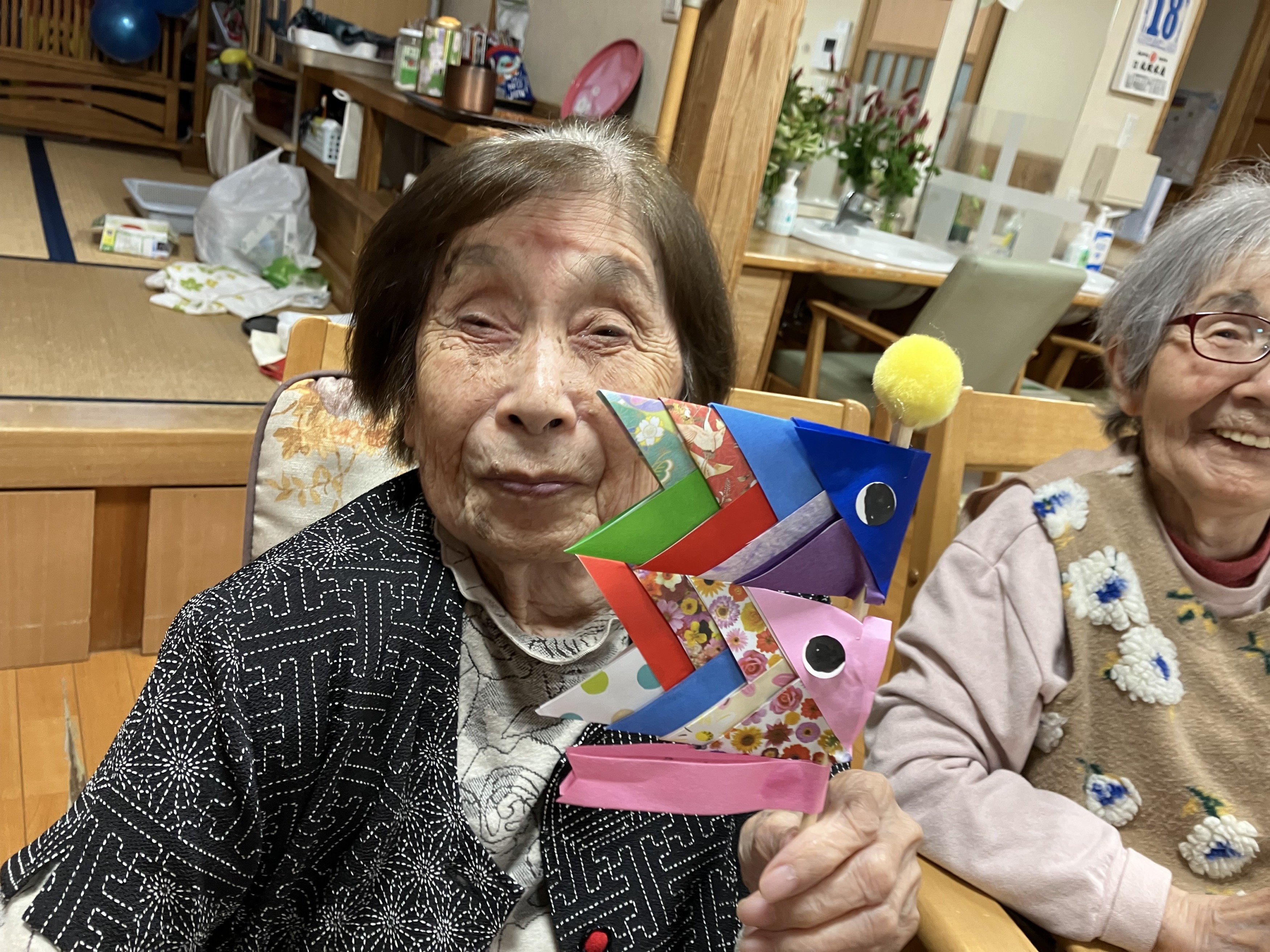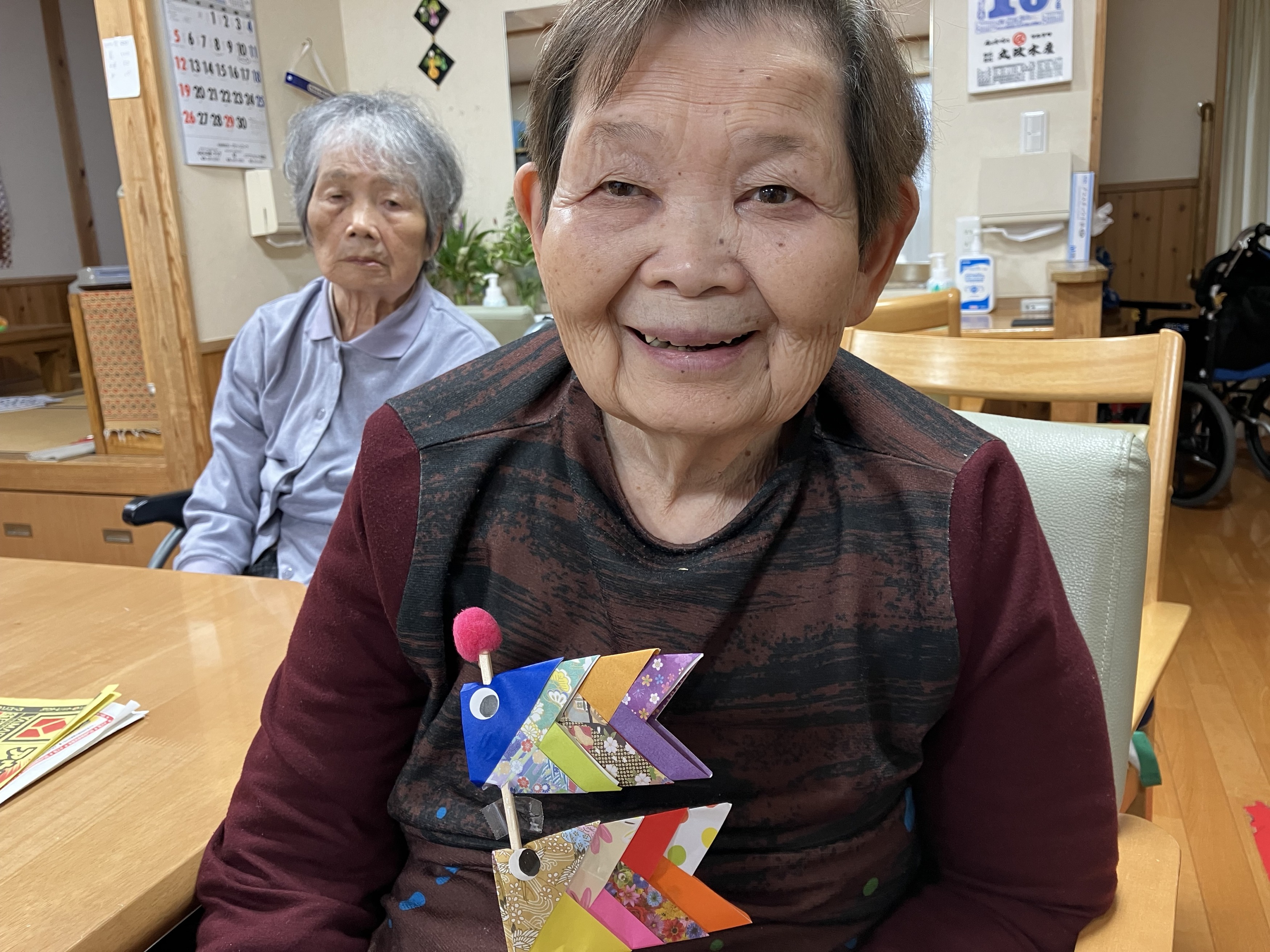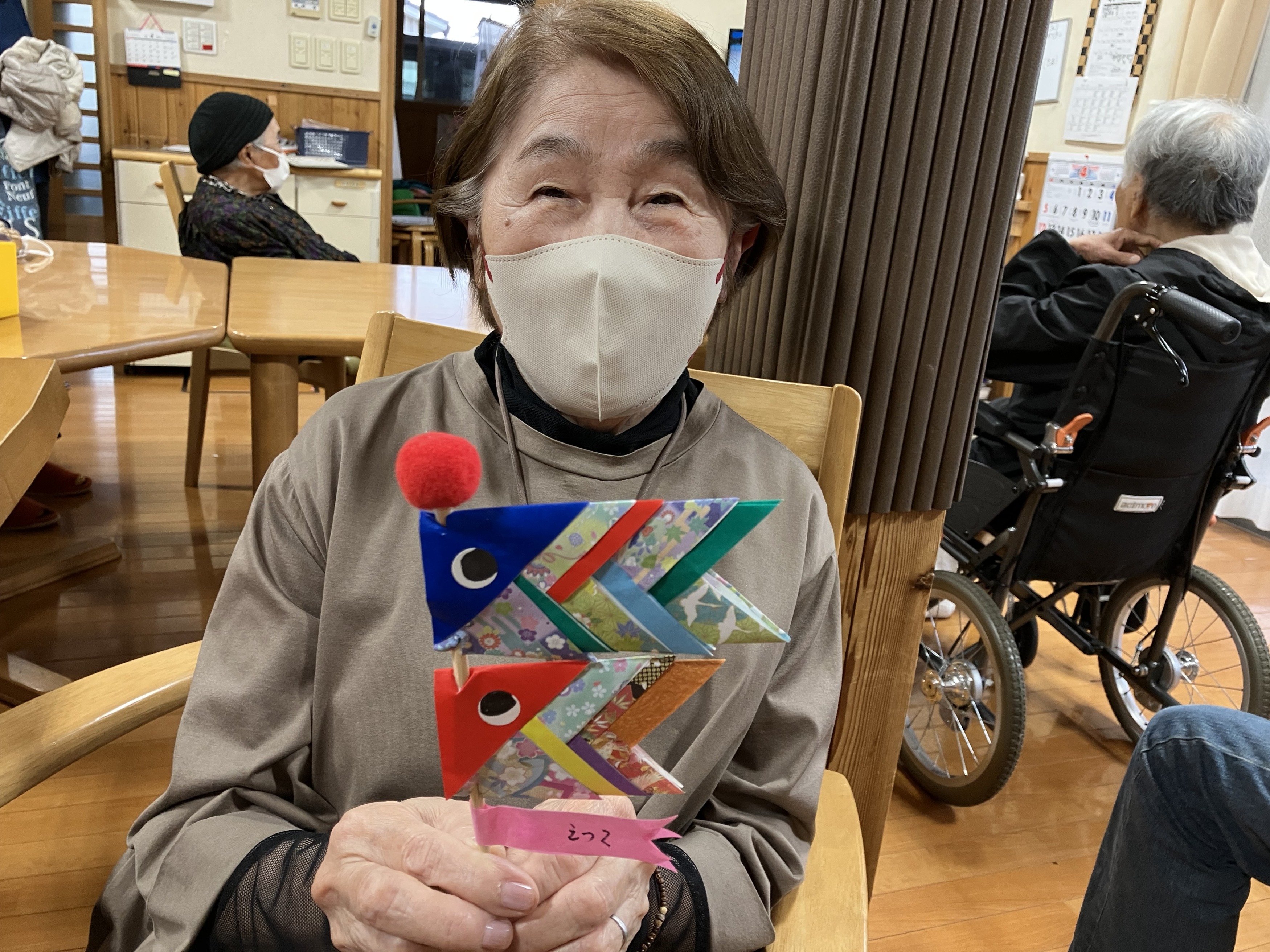 折り紙を1枚1枚丁寧に折り、重ねて貼りあわせて鯉のぼりを作りました