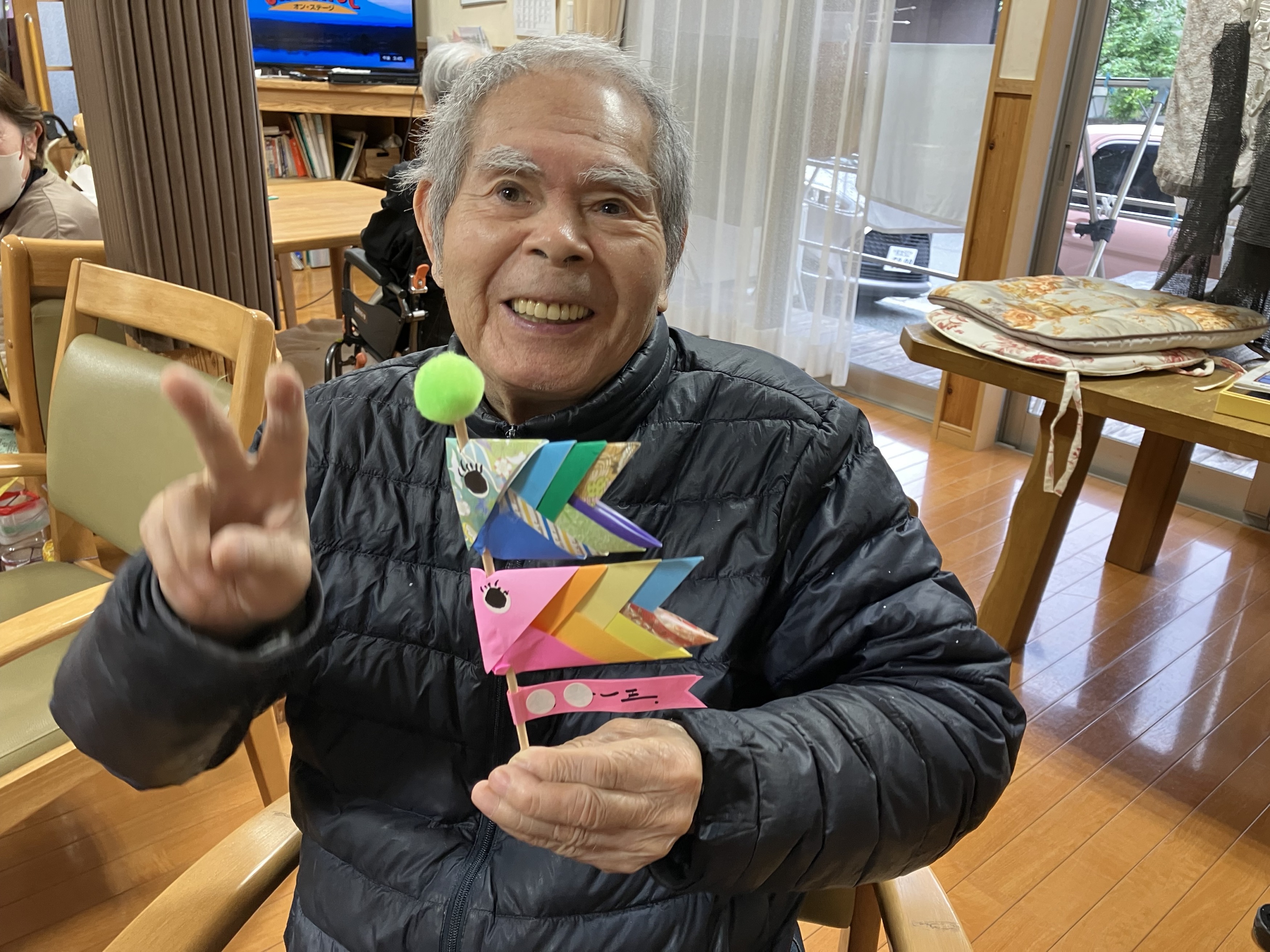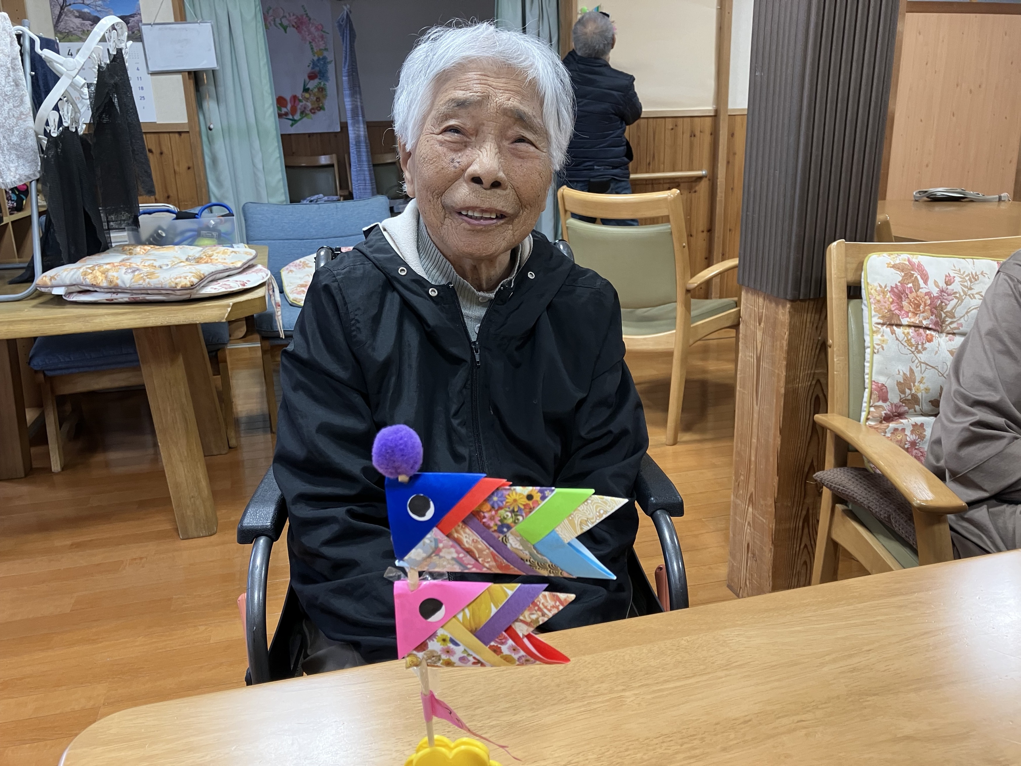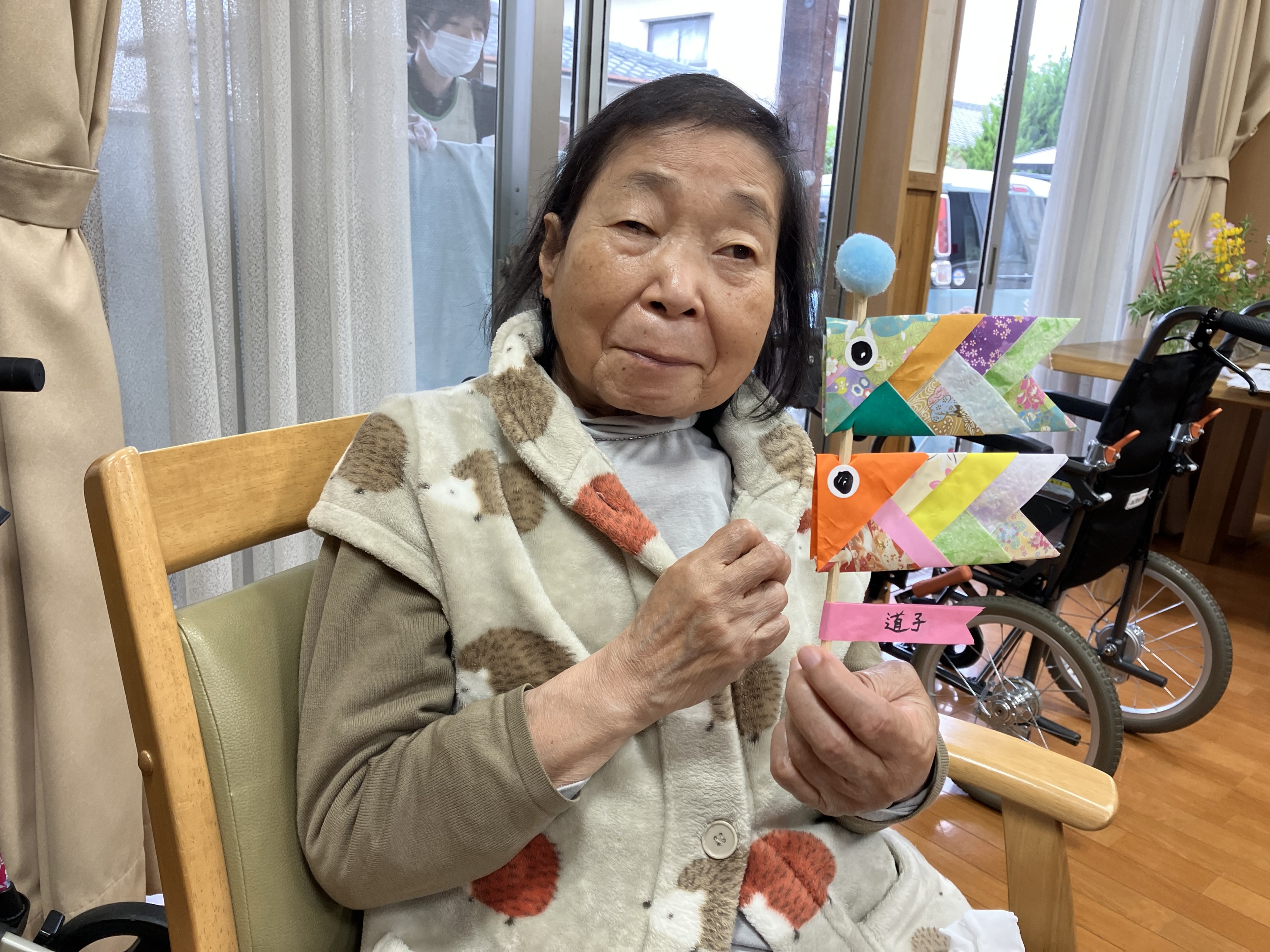 折り紙を1枚1枚丁寧に折り、重ねて貼りあわせて鯉のぼりを作りました