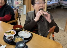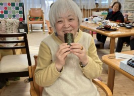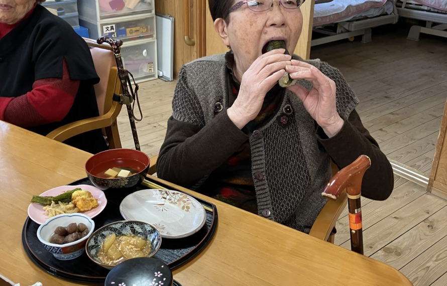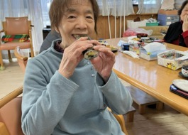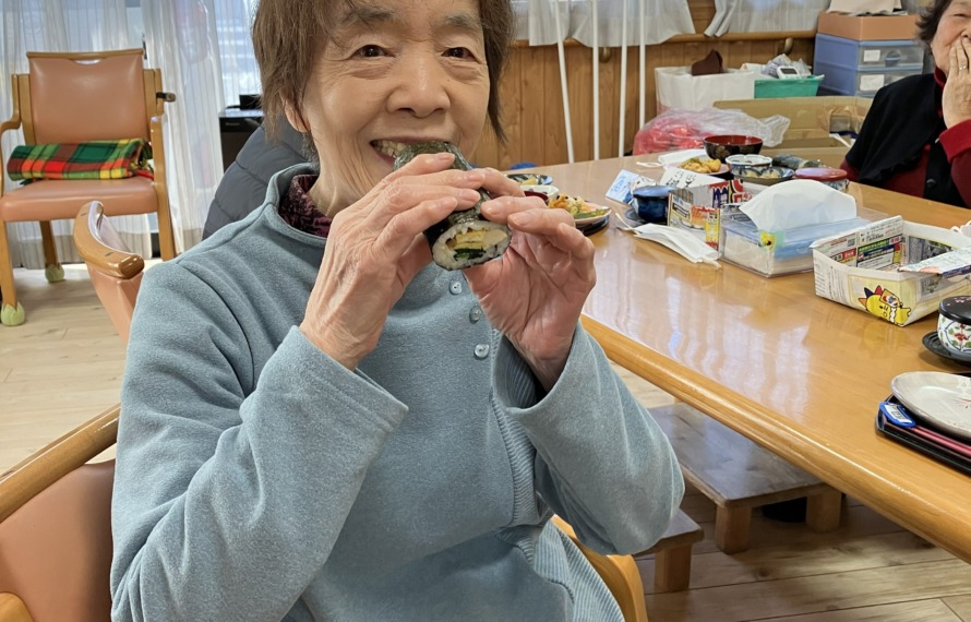 2月は、節分の日に、スタッフ手作りの恵方巻を大きな口を開けて食べました