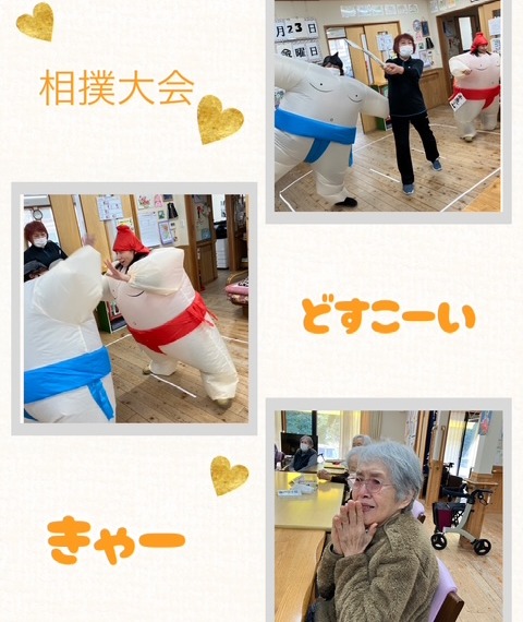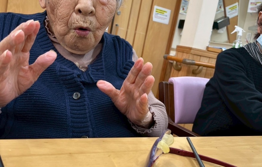 多目的室にて機械などで運動をし看護師の声掛けのもとみなさまに合った体操をします。 ビーチボールなどを使いアイスホッケーや輪投げ・バレーなど行います。間で水分補給行い時々甘いものも摂取します。 火曜日・金曜日は元気カーが来所するので買い物をする時間にもなります。
