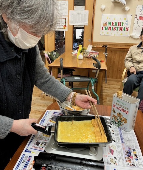 食後はゆっくりする時間となります。 静養室でお休みになる方や脳トレプリント・体操・クッキングレクなど行います。クッキングレクではオヤツに提供する準備もします。