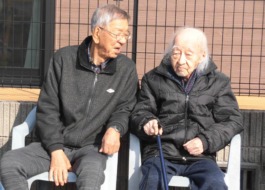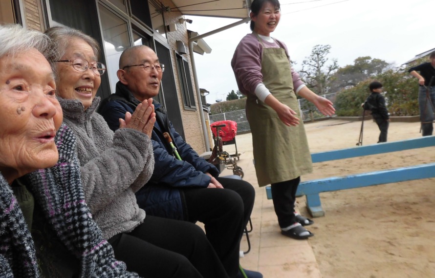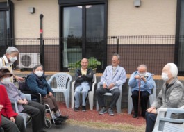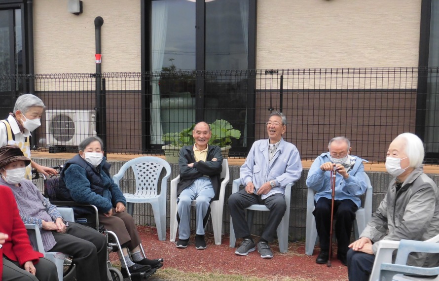 園庭を歩かれた後、お庭で椅子に座り、利用者同士でのお喋りタイム!スタッフも加わり笑い声が絶えません。時には一緒に、季節の歌を歌う時もあります