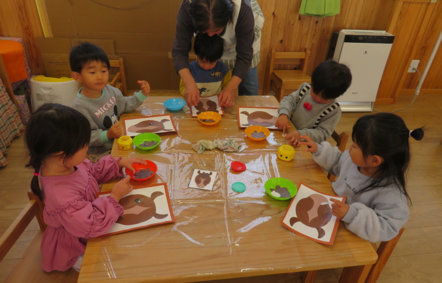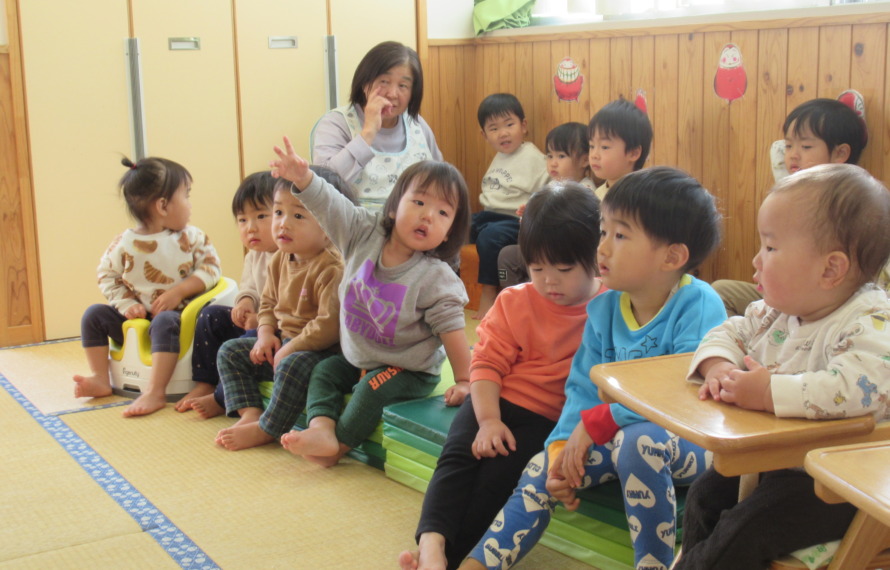 日頃から、絵本の読み聞かせやわらべうたを多く取り入れ、ぺぺぺぺらんからもおはなし会に来ていただき、たくさんの言葉や絵本、歌に触れることができるようにしています。