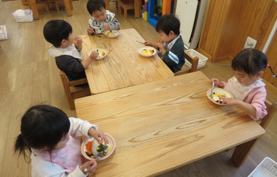 ・ひよこ組:11:00~・うさぎ組:11:10頃~・こあら組:11:15頃~ 安心・安全でみんなが大好きな給食です♡